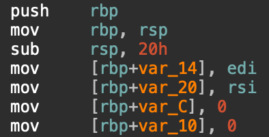 추측하건대 변수 var_14, var_20을 선언하고, 변수 var_C, var_10 선언 후 0으로 초기화하는 것을 mov instruction을 통해 확인할 수 있다.