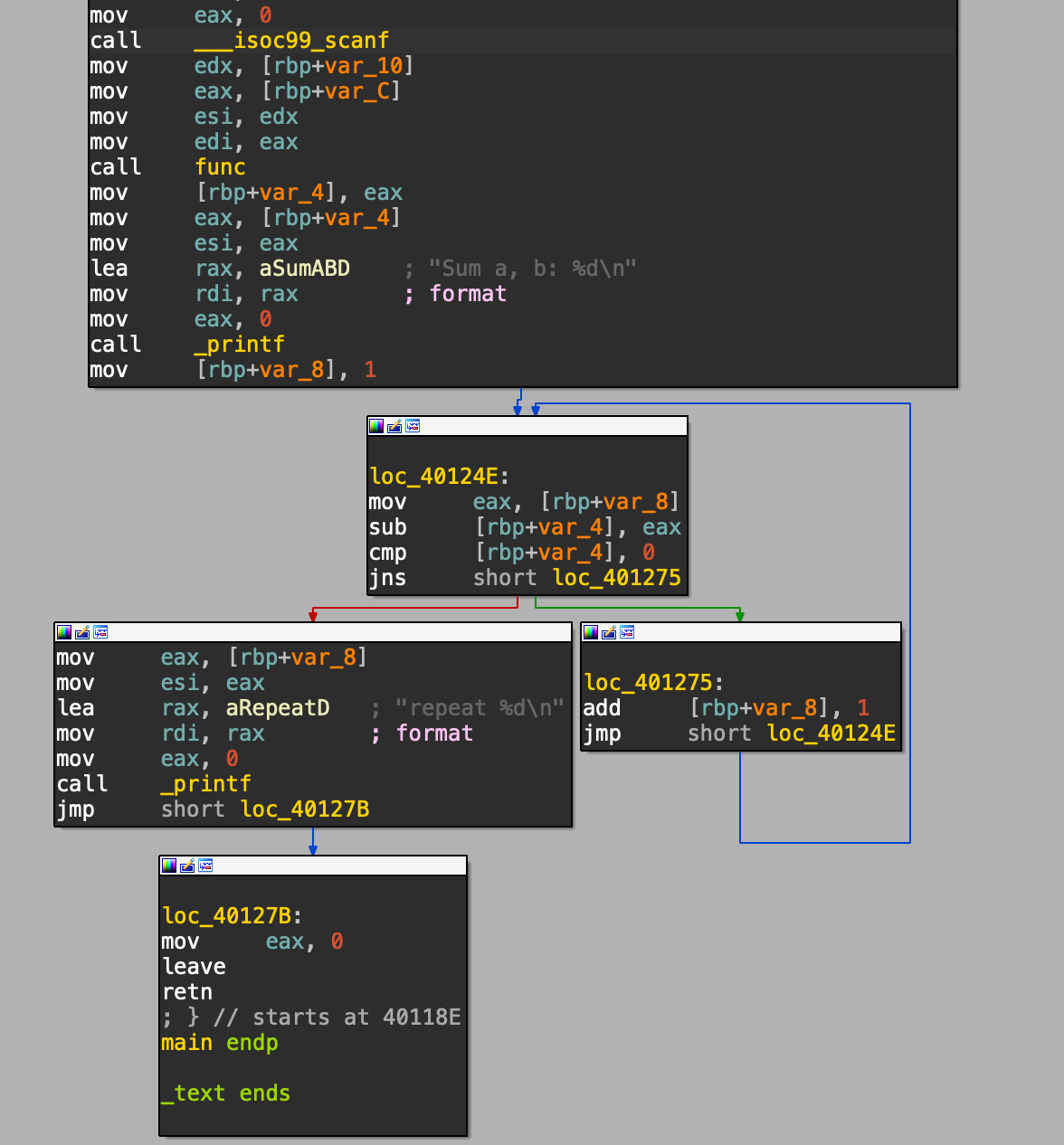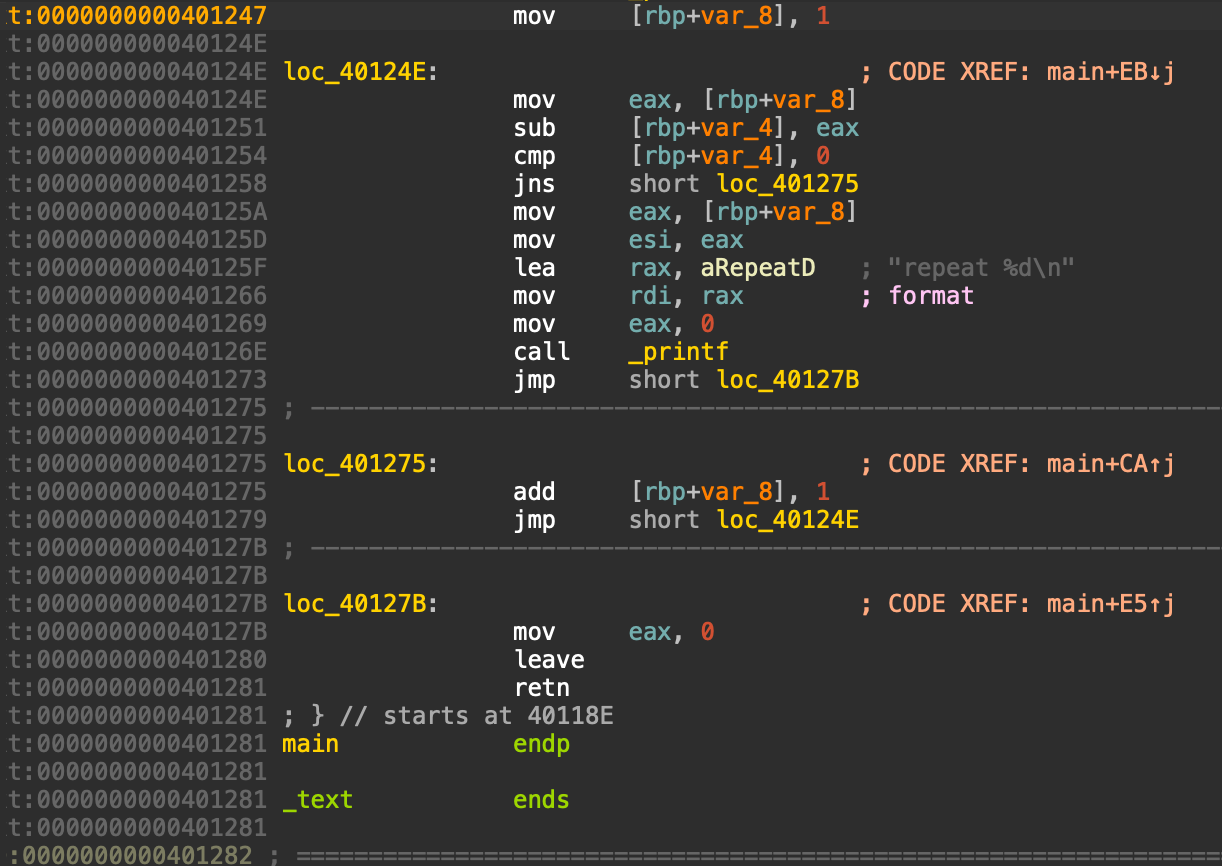 variable var_8을 eax로 이동하고 이를 esi로 이동 후, "repeat %d\n"라는 string이 담겨있는 aRepeatD의 address를 rax로 이동시킨다. 이 rax를 rdi로 이동시키고 위와 같이 printf를 call 하기 전, 0을 eax로 이동한다. function printf의 첫 번째 인자인 aRepeatD("repeat %d\n"), 두 번째 인자인 var_8을 받아 printf가 call 되는 것을 확인할 수 있다. 여기서 주의해야 할 부분은, repeat라는 string을 보았을 때는 마치 이 string이 repetation 하게 print 되는 것처럼 보이지만 우리는 자연어가 아닌 assembly에 주목해야 된다는 사실을 망각하면 안 된다. 위에서 살펴봤듯이 이는 condition에 충족해 loop에서 빠져나온 후의 code임을 명심하자. function printf를 call 하여 "repeat %d\n" print 후, loc_40127B location으로 jmp 한다.