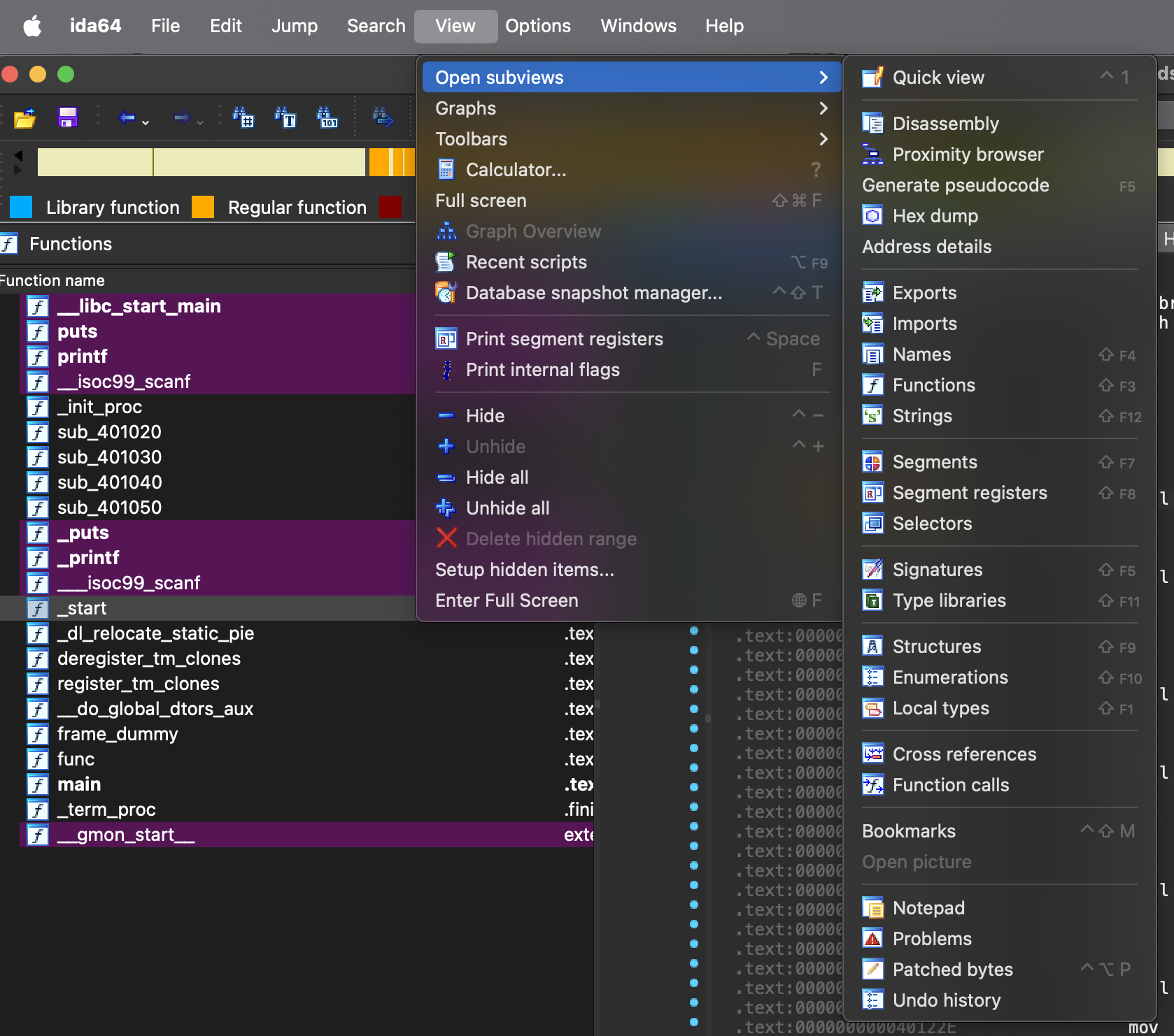 왼쪽의 Function list에서 main func를 찾아서 들어가 본다. call 함수를 확인해 보면 각각 _puts, _printf, _scanf, _func 라는 4개의 함수를 main function안에서 호출하고 있음을 확인할 수 있다. 부가적으로, 이 program이 대충 어떤 것을 출력하는지, 저장된 문자열이 어떤 것인지를 확인하고 싶으면 Strings subviews, 즉 프로그램 바이너리 내에 포함된 문자열을 나열해 주는 기능을 사용하면 된다. 이를 통해 코드 분석자는 프로그램 내에서 사용된 다양한 문자열을 볼 수 있고 문자열은 종종 프로그램의 기능이나 작동 방식에 대한 힌트를 제공하기 때문에 생각보다 유용하게 쓰이는 경우가 많다.