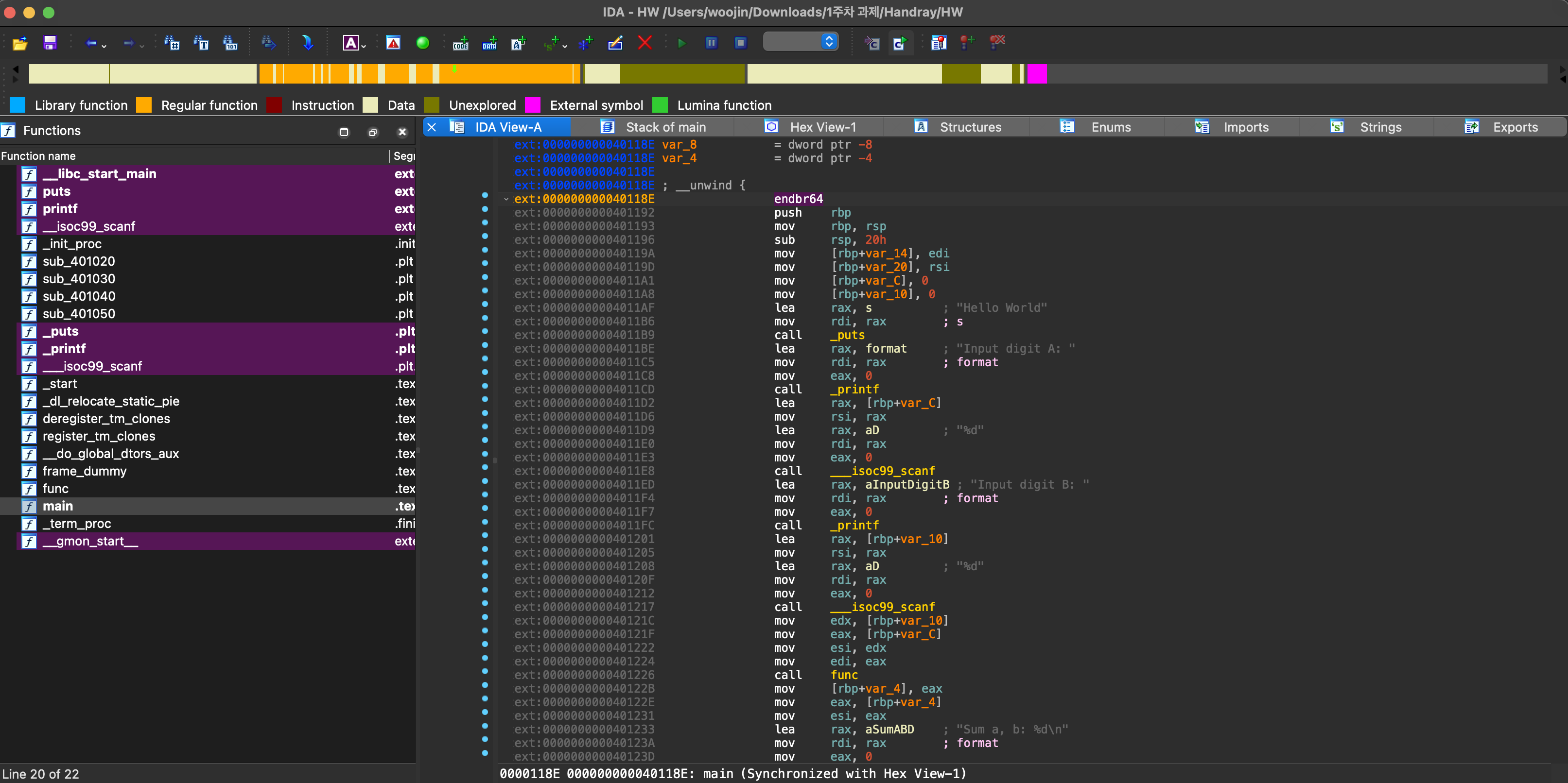 1. Handray 폴더 안에 존재하는 HW 파일의 main 및 func를 어셈블리어만 보고 C 언어로 바꾸기