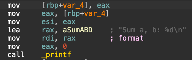 "Sum a, b: %d\n"이라는 string이 저장되어 있는 aSumABD의 address를 rax로 이동시키고, rax를 rdi로 이동시킨 후 0을 eax로 이동시킨다. 위에서 살펴보았다시피, printf는 가변 인자 함수이고 여기서는 인자 1개만 받고 있으므로 eax에 0이 할당된다. function printf의 인자인 aSumABD를 받아 printf를 call 하는 것을 확인할 수 있다.