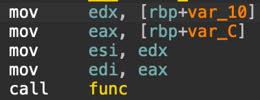 이후 variable var_10, var_C를 각각 edx, eax로 이동시킨 후 다시 esi, edi로 이동시킨다. 이후 func를 호출하는데 이 function func에 대해 알아보자.
