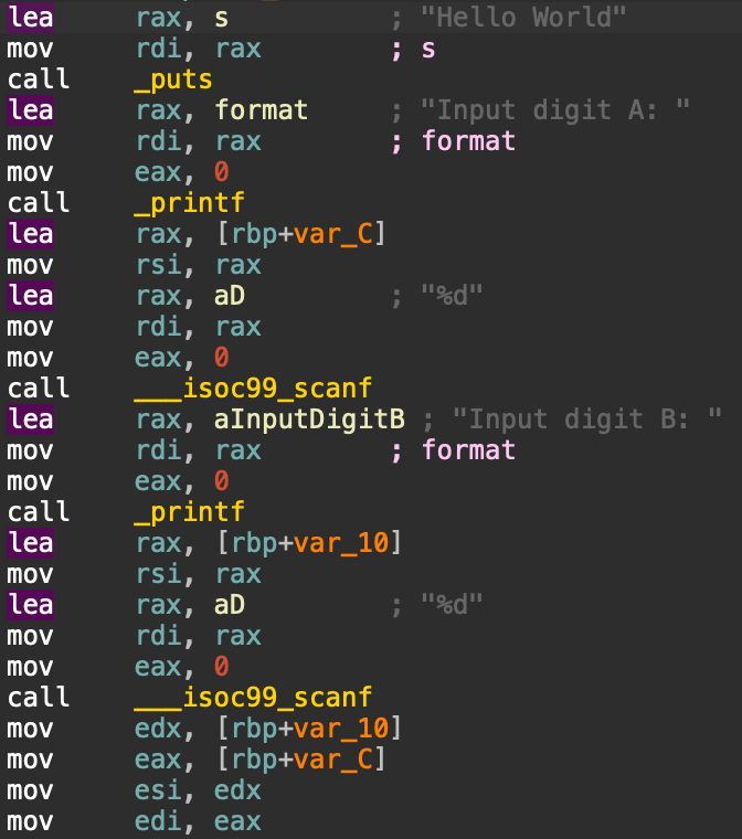 *살펴보기 전, 위 instuctions를 확인해 보면 lea instruction으로 some variables("s", "format", "aD", "aInputDigitB", aSumABD")의 address를 rax로 이동하는데 여기서 이 some variables는 program에서의 variable name이 아닌 IDA에서 임의로 할당한 variable임을 알아두자.