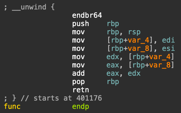 edi과 esi를 variable var_4, var_8에 각각 이동시키는 것을 할 수 있다. 아까 edi와 esi에 variable var_10, var_C가 들어있었다는 점으로 미루어보아, function func가 해당 variable의 값을 인자로 받고 있음을 유추할 수 있다. 값이 저장된 var_4, var_8을 각각 edx, eax에 이동시킨 후, edx에 eax를 더한 값을 eax에 저장하고 rbp를 pop 하는 모습을 확인할 수 있다. 이러한 흐름으로 볼 때, function func는 인자 2개를 받아 덧셈한 값을 return 하는 함수임을 확인할 수 있다. 마지막 줄의 func endp는 func로 define 된 function이 여기서 끝난다는 것을 알려준다. 또한 그 윗줄의 주석은 0x401176 address에서 해당 function이 실행됨을 나타낸다.(친절한 IDA..)
